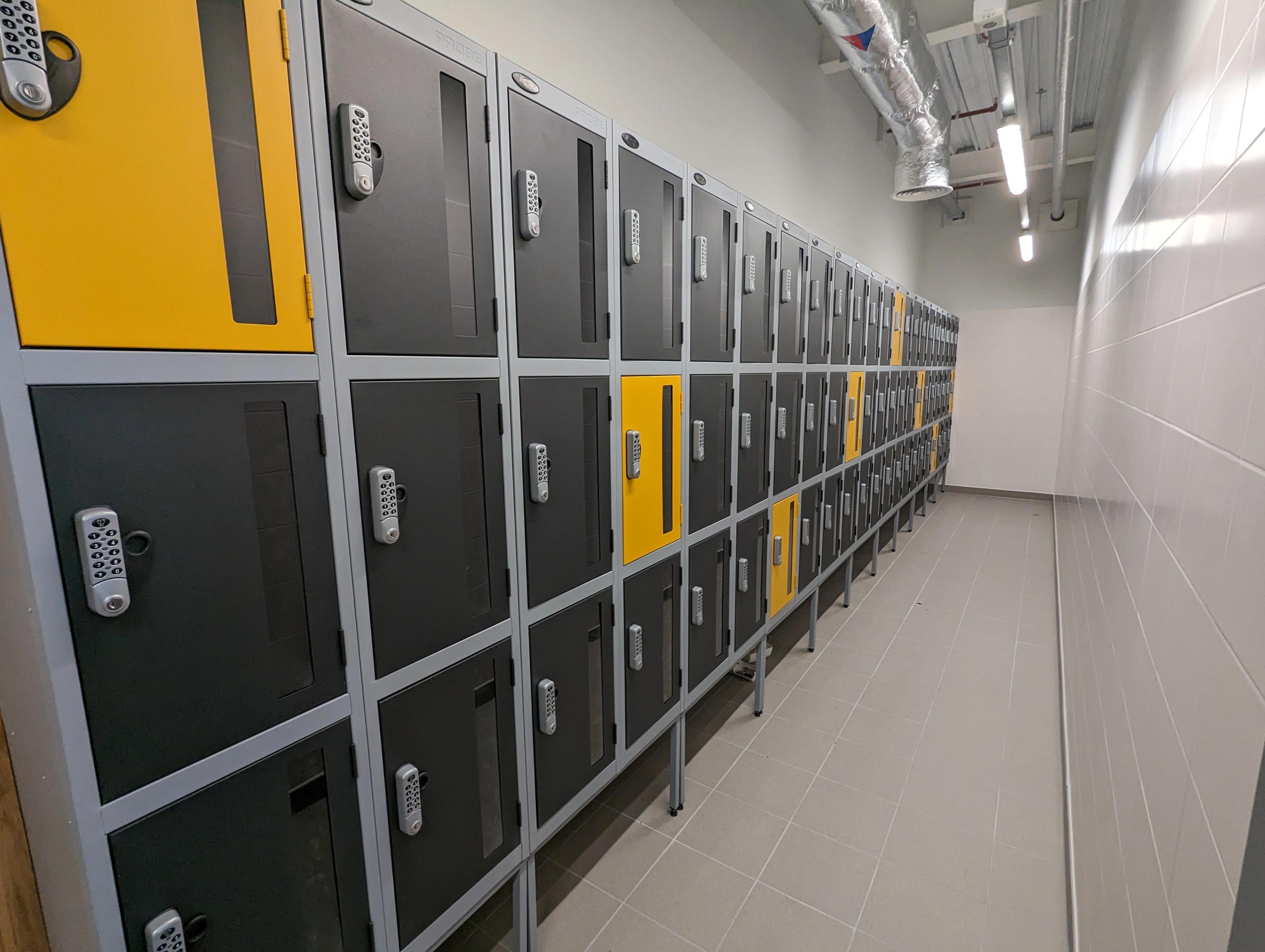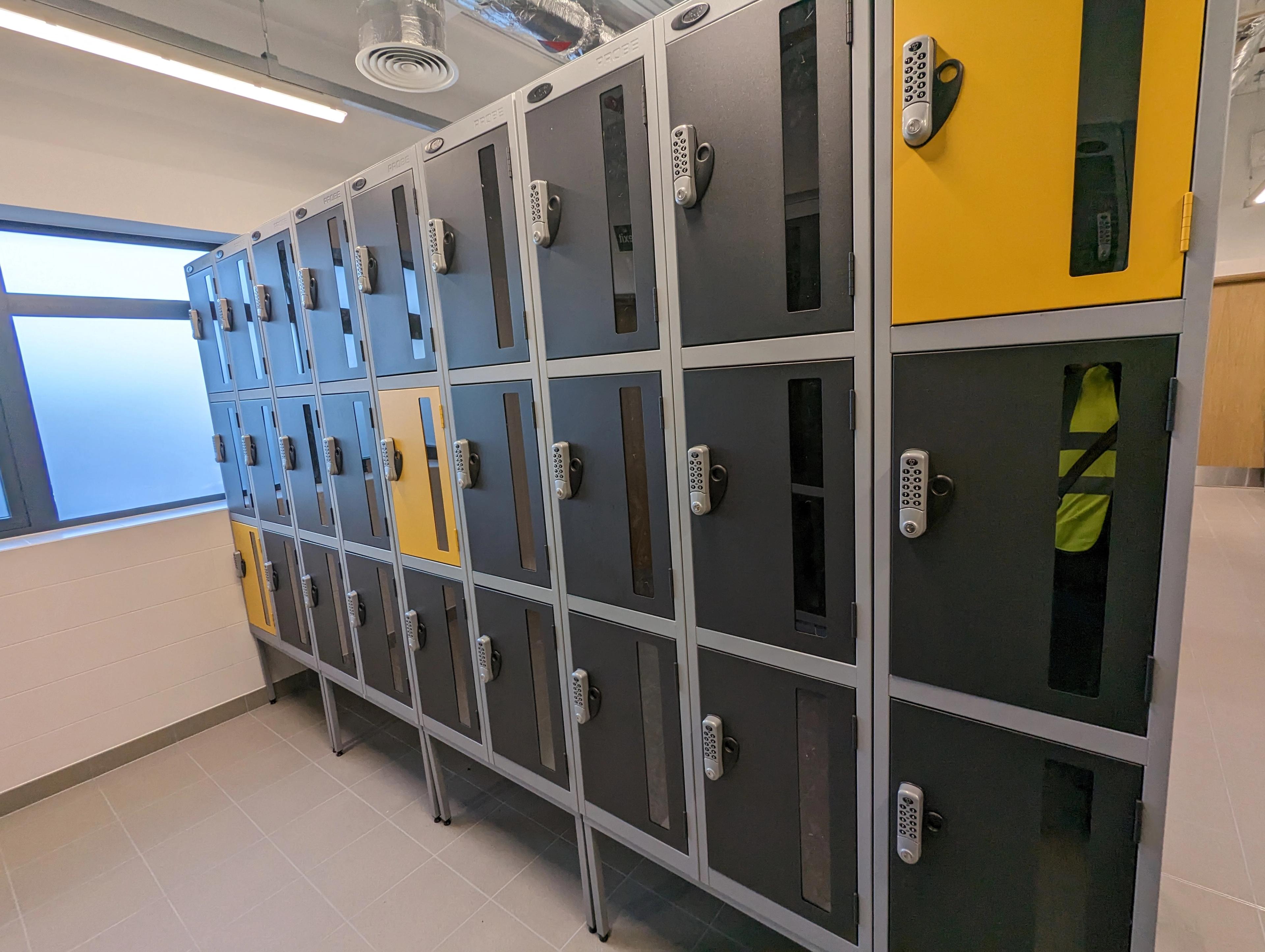 The customer decided on 3 tier lockers with sloping tops and vision panel doors, their corporate colours from our extensive colour range, and a digital lock for each.