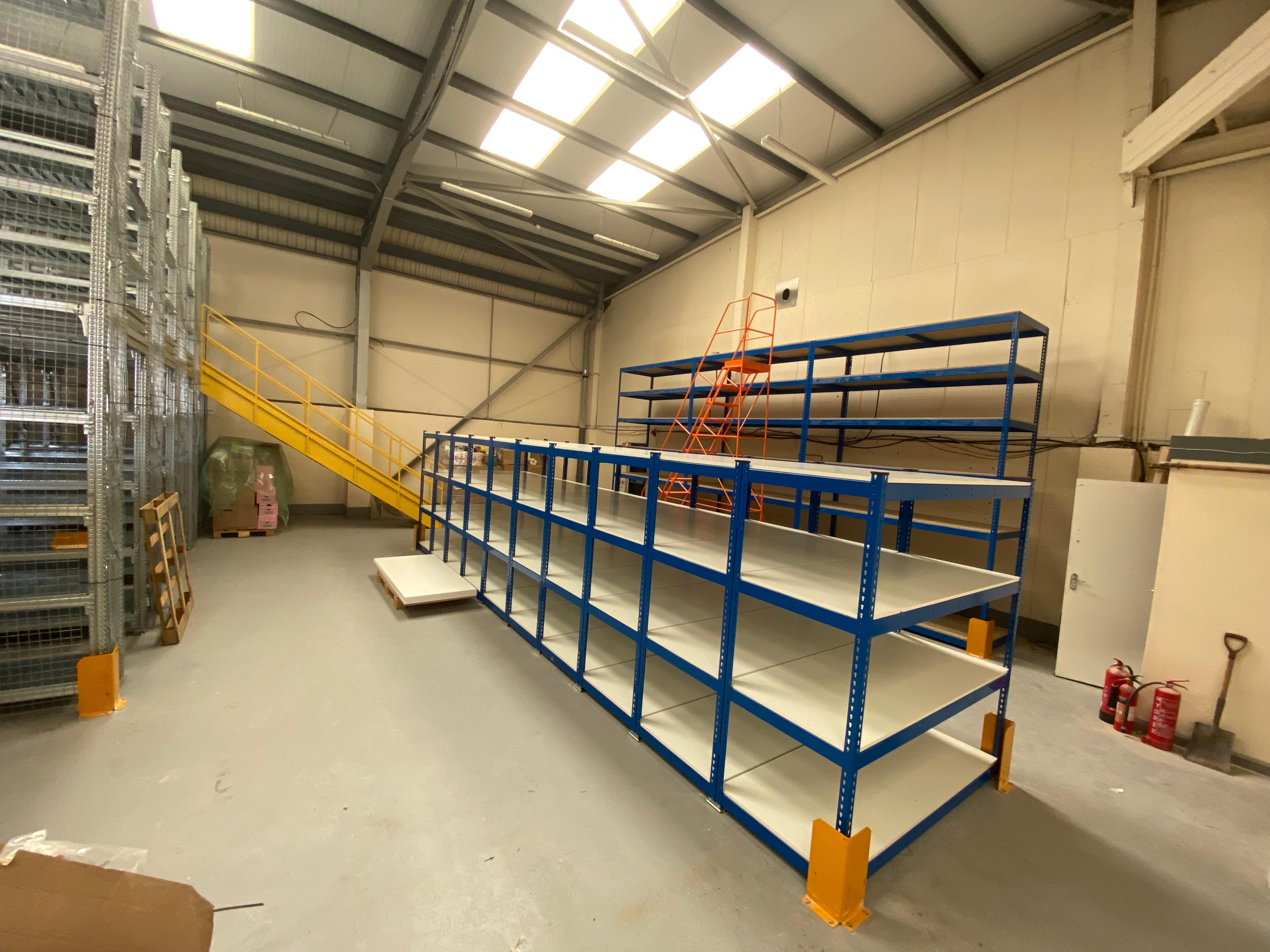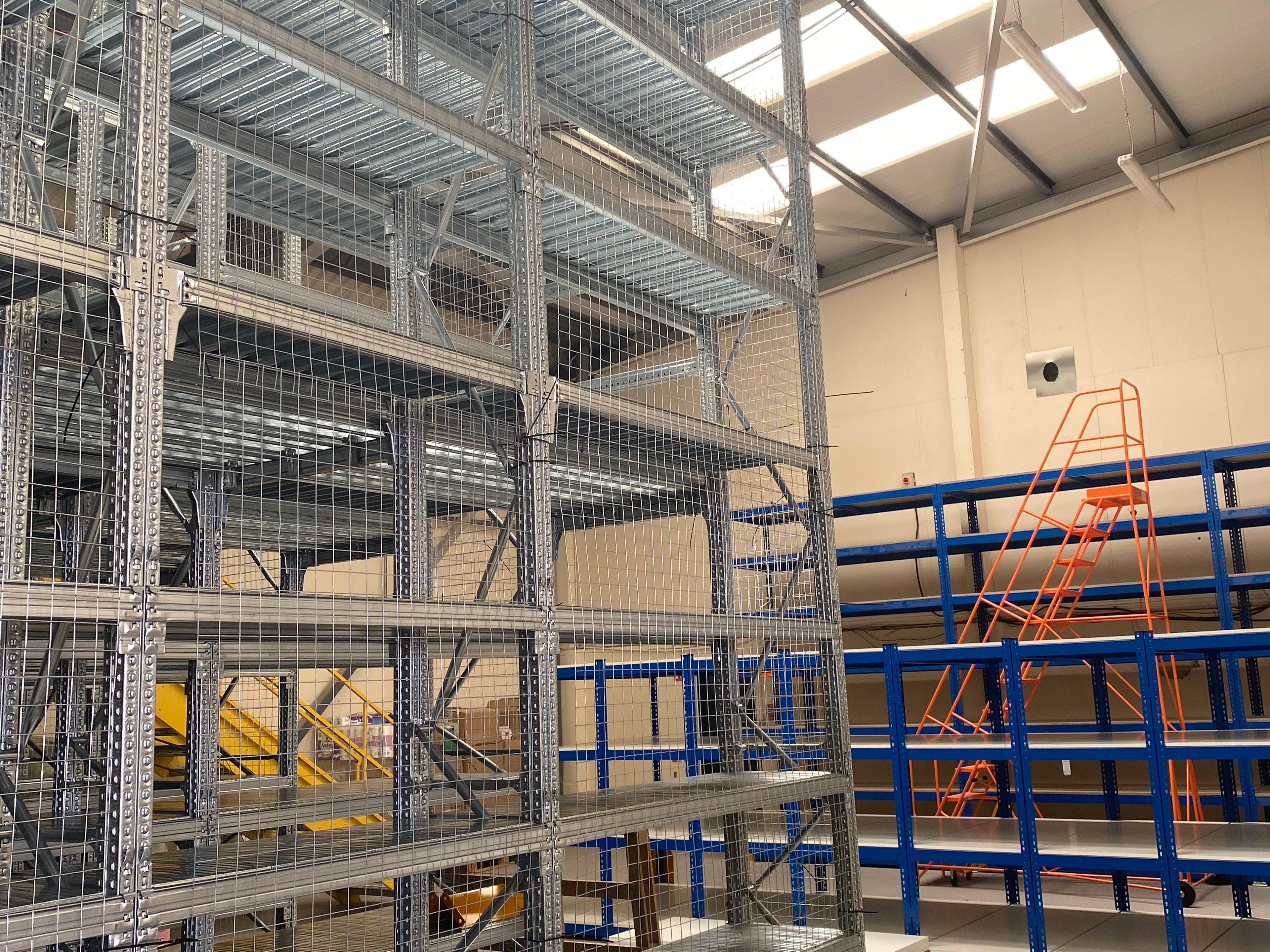 We installed a two tier shelving system including multiple shelf levels for picking with a staircase, anti-collapse mesh, floor fixed safety guards and rivet rack shelving to suit the clients requirements.